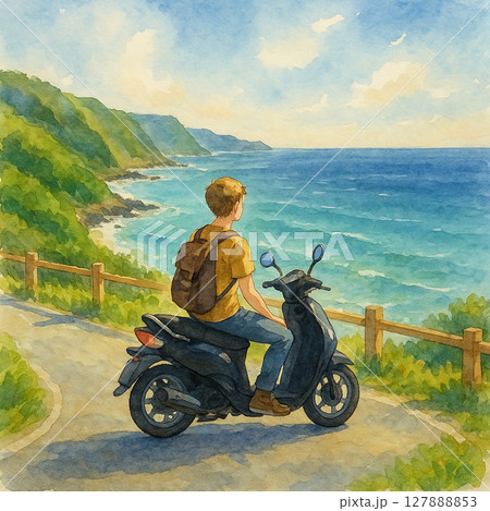 摩托車旅行插畫 | 青春旅人與藍色海岸 | 摩托車旅行,海邊,青春瞬間,水彩插畫