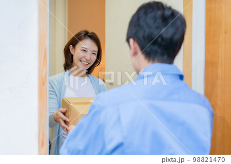 Asian courier with parcel and delivery logistic concept. Delivery man using digital tablet