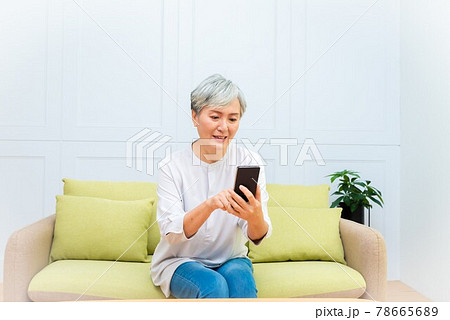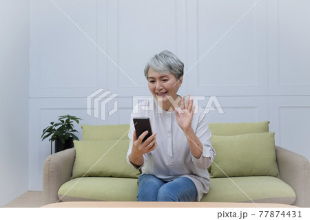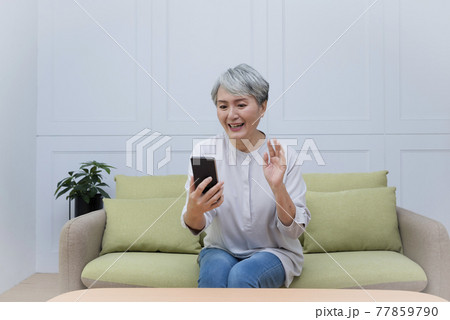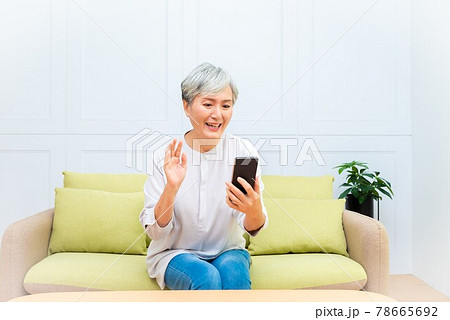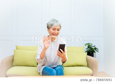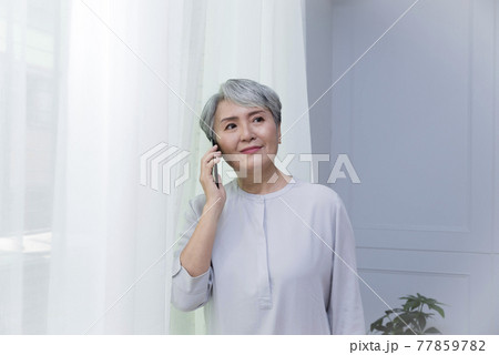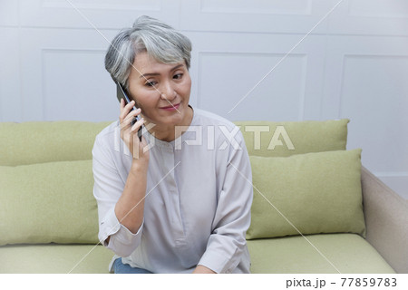 一位銀髮族年長婦女講手機電話,享受悠閒自在的生活