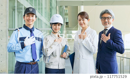 各種職業的人(商人、工程師、研究人員、保全)雙手放在胸前