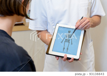 在骨科診所、整脊診所、骨科診所或診所的平板電腦屏幕上向患者解釋人體骨骼模型的場景