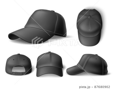Realistic baseball cap mockup. 3d black sports and casual headgear object, trendy clean model different view angles. Top, front and side, marketing branding template vector isolated set