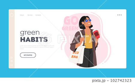 Green Habits Landing Page Template. Woman Holding Reusable Bag. Character Promoting Environmentally-friendly Habits