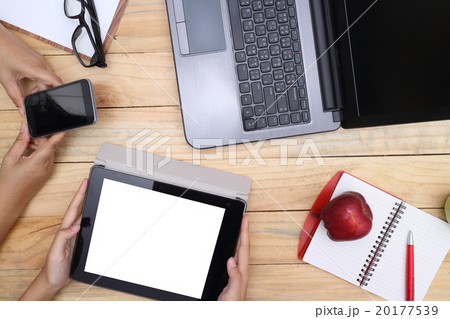 Top view of hand working at wooden table