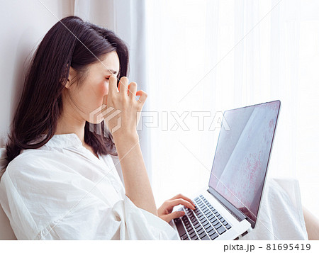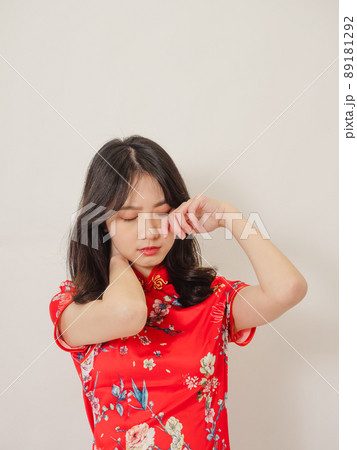 Tired woman with closed eyes kneading neck