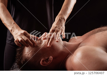Facial massage therapy session for a man, therapist applying pressure points around eyes and temples in spa.