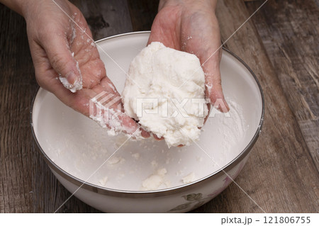 Kneading bread dough by hand on wooden board
