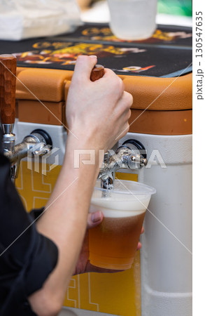 從啤酒桶向塑膠杯倒入生啤酒