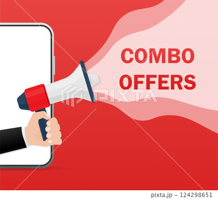 Template with red combo offers megaphone on red background for flyer design. Vector illustration in flat style.