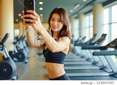 年輕女子在運動俱樂部自拍 健身愛好者 Instagram 上值得一看的運動員 [AI 生成的圖像]