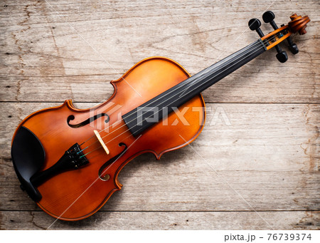 Brown violin on wooden background. Art and music background. Top view.