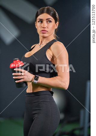 young woman dressed in black athleisure stands confidently in gym. She holds shaker bottle preparing for her fitness routine among workout equipment.