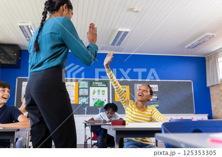 In school, Indian female teacher giving high-five to excited student in classroom, copy space