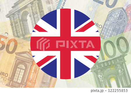 UK United Kingdom flag on Euro banknotes money, finance investment business.