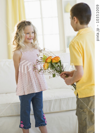 Young boy giving flowers to young girl