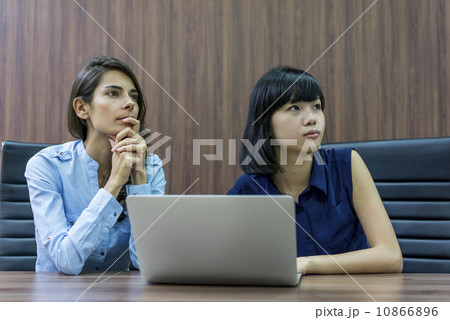 Two Female Asian executives having a discussion at the desk, looking into the laptop