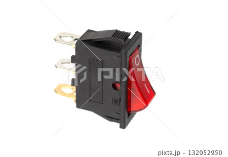Black rectangular rocker switch with a red illuminated button and metal terminals, isolated on white.