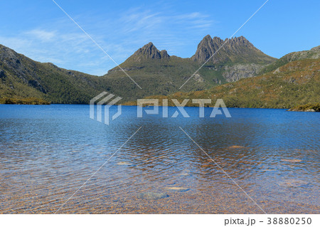 搖籃山通過鴿子湖岸上的一間小屋的視圖