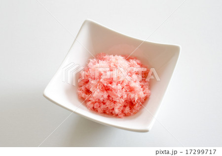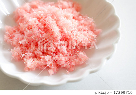 粉紅色背景的櫻花丹布,盛於盤子和湯匙上