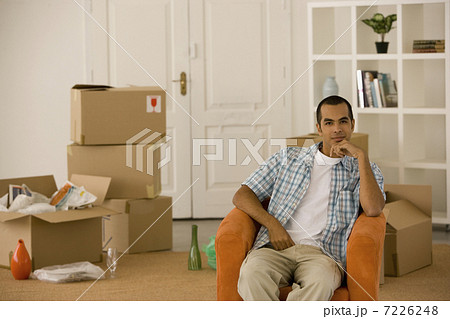Happy Woman Relaxing Next to Boxes on Floor with Cup