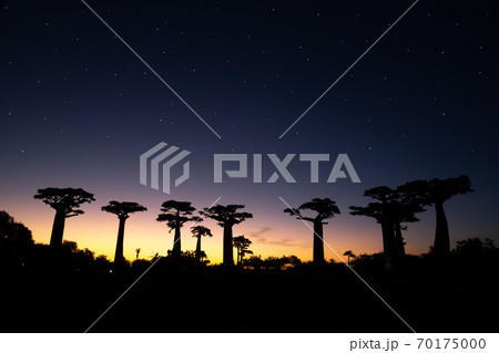 Stunning view of Baobab Avenue with majestic silhouette of trees in foreground, Morondava, Madagascar