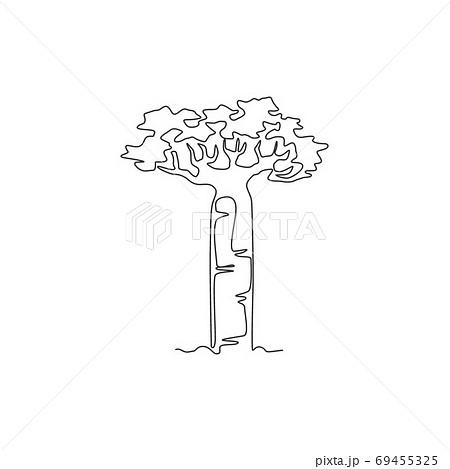 Single continuous line drawing giant baobab tree for wall decor poster. Gigantic plant concept for national park. Tourism and travel vacation concept. One line draw graphic design vector illustration