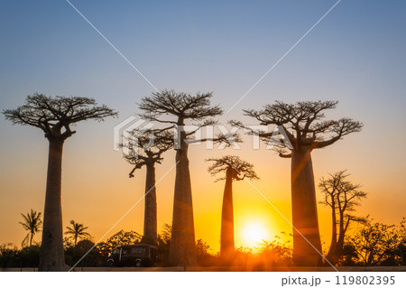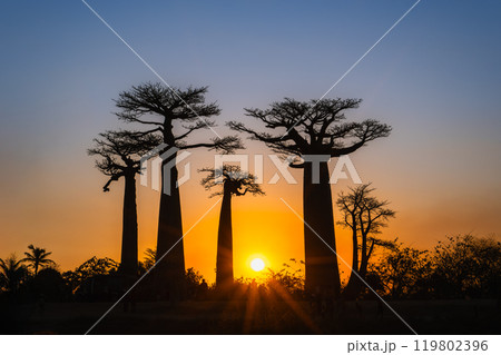 Spectacular view of Baobab Avenue with majestic silhouette of trees in foreground, Morondava, Madagascar