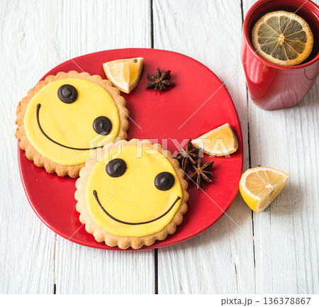 Cup of hot tea with lemon and cookies