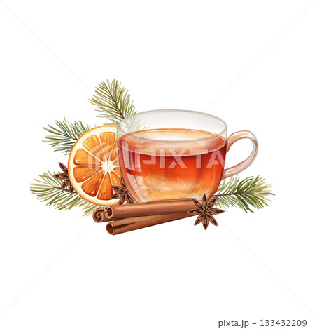 Isolated illustration of a glass cup with hot tea, garnished with an orange slice, cinnamon sticks, star anise, and pine branches