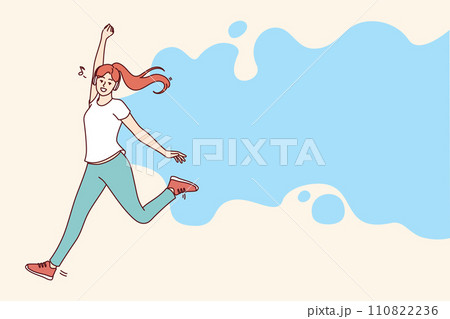 Woman listens to music on headphones and dances or jumps doing aerobics to sounds of favorite song