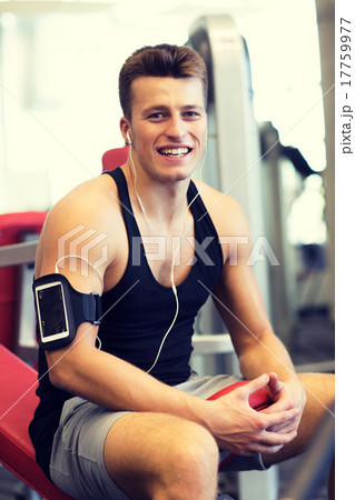 smiling sportsman with smartphone and earphones