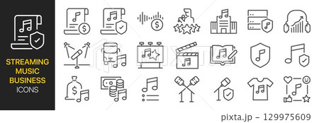 Streaming Music Business icon set. It included royalty, licensing, concert, single, and more icons.