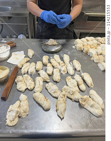 在傳統市場拍攝攤販熟練的用擀麵棍擀水餃皮