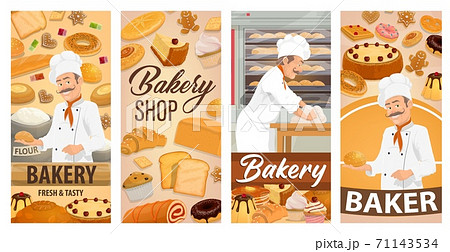 Happy baby boy sits in cook costume among baking bread rolls on the table on black background