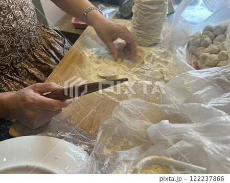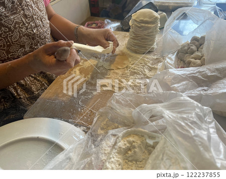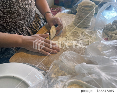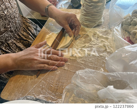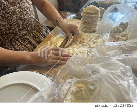 在傳統市場拍攝攤販熟練的用擀麵棍擀水餃皮