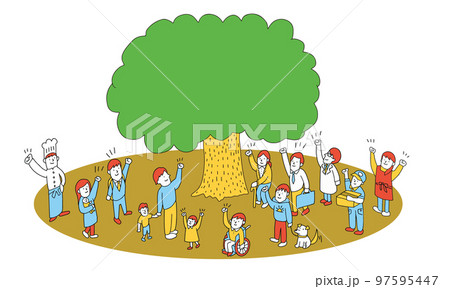 不同的人聚集在一棵大樹下 一個有遠見的社會的形象例證