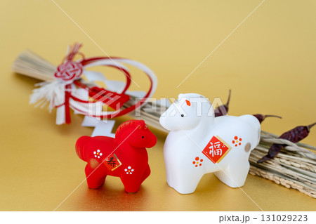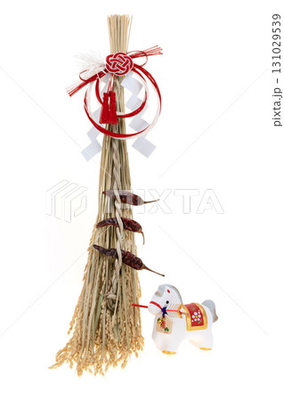 馬年新年材料:手持哈馬亞箭和護身符的白馬,辣椒裝飾