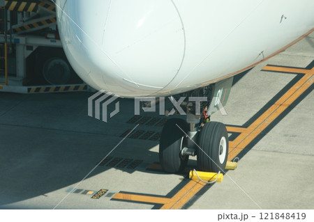 An old cracked mountain bike tyre. Close-up. A studded wheel of a mtb bicycle. Blurred transmission and pedals in the background. Mountain bike in the workshop.