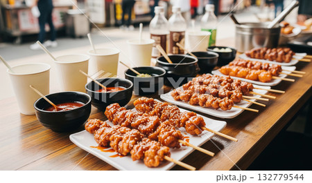 Korean Street Food Stall with Chicken Skewers and Sauces