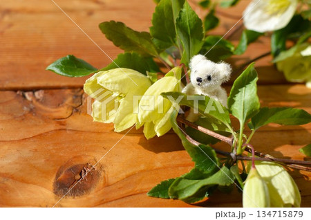 白色的冬季開花鐵線蓮和一隻小泰迪熊