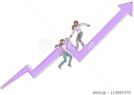 Single continuous line drawing businesswoman helps colleague to climb the rising arrow symbol. Help each other to achieve satisfactory targets. Grow together. One line design vector illustration