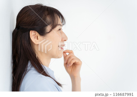 在藍色背景下拍攝的一位年輕女性的流行化妝形象