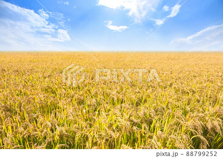 秋季藍天下壹望無際待收割的水稻