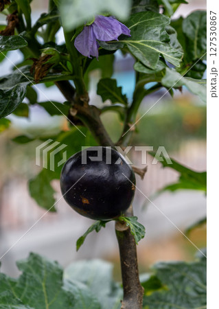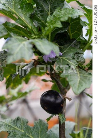 一株成熟的紫色茄子,上面掛著葉子,背景則是花園。