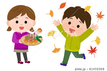 秋季形象:男孩玩落葉,女孩撿栗子,插圖
