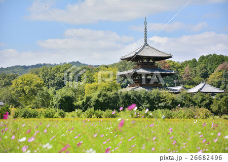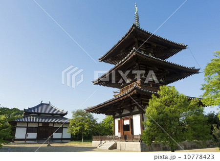 樂高寺,三重塔,寺廟,神社,世界文化遺產,世界遺產,西門,女修道院,寺廟公司大樓,文化財產,Ikaruga鎮,旅遊景點,旅遊景點,奈良縣,關西,近畿,日本