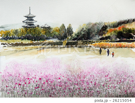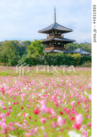 秋天晴朗的傳說寺廟三重塔和波斯菊