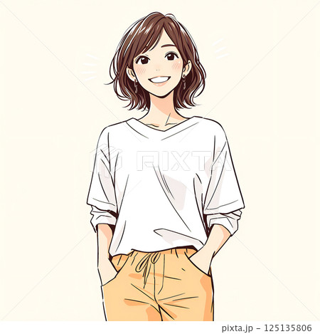 一個簡單的插圖,一位女士穿著灰色毛衣,雙手插在口袋裡