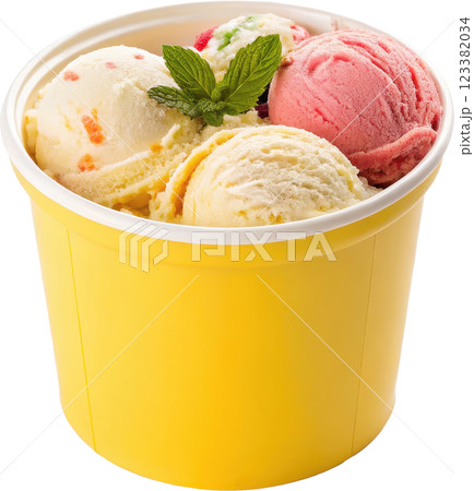 Vibrant Ice Cream Scoops in a Sunny Yellow Container with Mint Garnish