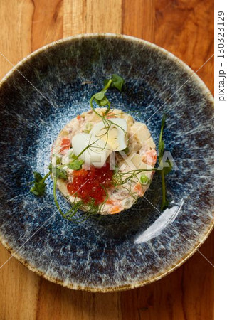 An Elegant Seafood Dish beautifully presented with exquisite caviar and vibrant microgreens
